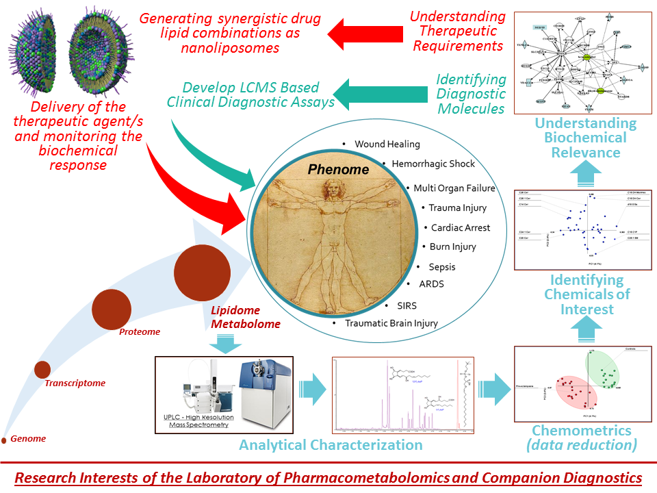 Our laboratory's research interests span the disciplines of pharmacometabolomics and companion diagnostics, clinical lipidomics, nanotechnology, analytical chemistry and chemometrics. These interests are focused towards the understanding, early diagnosis and evidence-based treatment of critical illness and injury. In this regards, we place a special emphasis on wound healing as an easily accessible and yet highly relevant disease model. Recent analytical characterization undertaken by our group has identified key chemical entities in the form of lipid molecules that are important for healing of chronic wounds. This enabled us to obtain a pre-patent on these chemical species as therapeutic agents. Currently, we are in the process of incorporating these lipids into nanoliposomes as a means of efficiently delivering them into skin wounds in order to enhance healing. As analyzed by LCMS, these novel nanoliposomes demonstrate greatly enhanced delivery of the therapeutic agents to cells of interest. We are also in the process of investigating other functional modifications and chemical conjugations to the components of the nanoliposomal formulations to increase the half-life of these therapeutic agents in the harsh chemical environment of chronic wounds. Considering the uniqueness of the approach, we have applied for a pre-patent of this nanoliposomal delivery mechanism as well. Additional analytical characterization coupled with chemometric methods have also allowed our group to identify metabolites that are diagnostic of the healed state of wounds. This knowledge has provided us with a short list of molecules to be used as diagnostic markers of wound healing and led to the possibility of generating a small point of care devices for monitoring the progress of wound healing by measuring the concentrations of these diagnostic chemical entities. In this regards, we are actively investigating the use of nanotechnology-based fabrication methods for use in Surface and Tip Enhanced Raman Spectroscopy (SERS and TERS) based point of care devices. This combined approach of 1) extensive analytical characterization; 2) chemometrics-based data reduction; 3) nanotechnology-based point of care device fabrication and 4) nanoliposome-based drug delivery when coupled with pharmacometabolomics and companion diagnostics are the primary research foci of our group. This multidisciplinary approach is currently being utilized in the understanding, diagnosing and treating many additional human diseases related to critical illness and injury as outlined in Figure below.